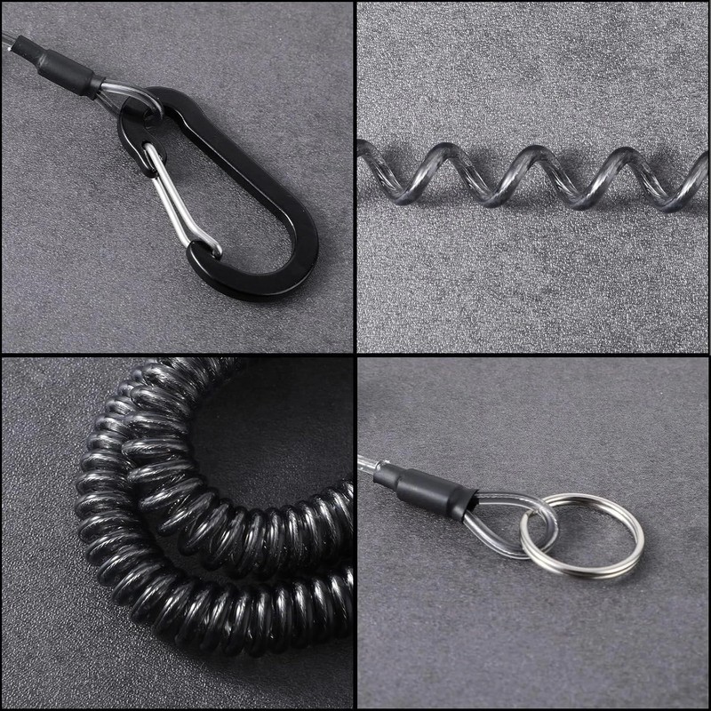 2Pcs Black Heavy Duty Fishing Rod Tether Accessories Ropes Tool, Retractable Safety Coiled Lanyard with Carabiner and Split Ring for Pliers, Boating, Tools