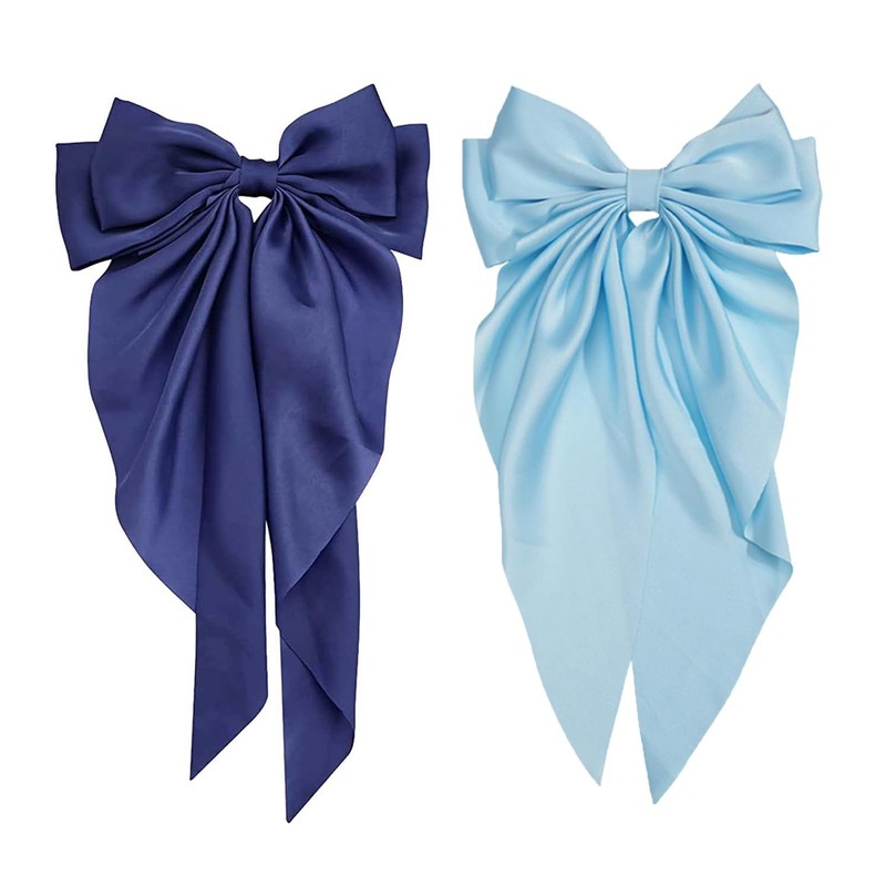 2Pcs Blue bow, Soft Satin Silky Navy Bow with Long Silky Satin Tail, Navy Hair Bow for Women Girls Toddlers Teens Kids (Sky blue Navy blue)
