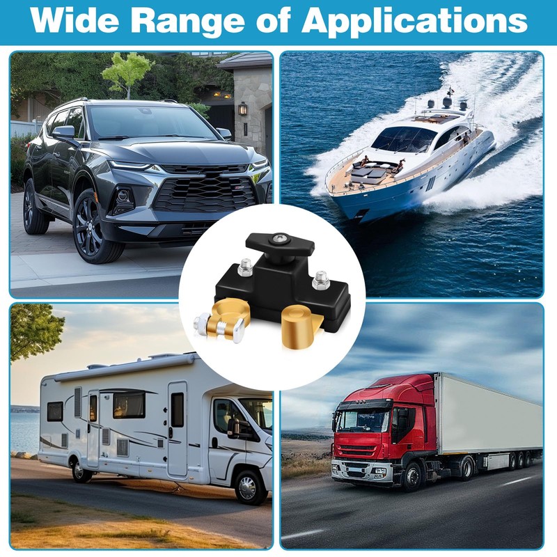 - 【Wide Applications】Car battery cut off switches are widely used in battery systems for various types of cars, including small vehicles such as sedans and sports cars, land vehicles such as trucks and vans. Our smart car battery disconnect switch products are widely used and suitable for a variety of 12V and 24V battery systems. Its dimensions are also scientifically determined, enabling easy operation and use, and offering you a very efficient experience of use.
