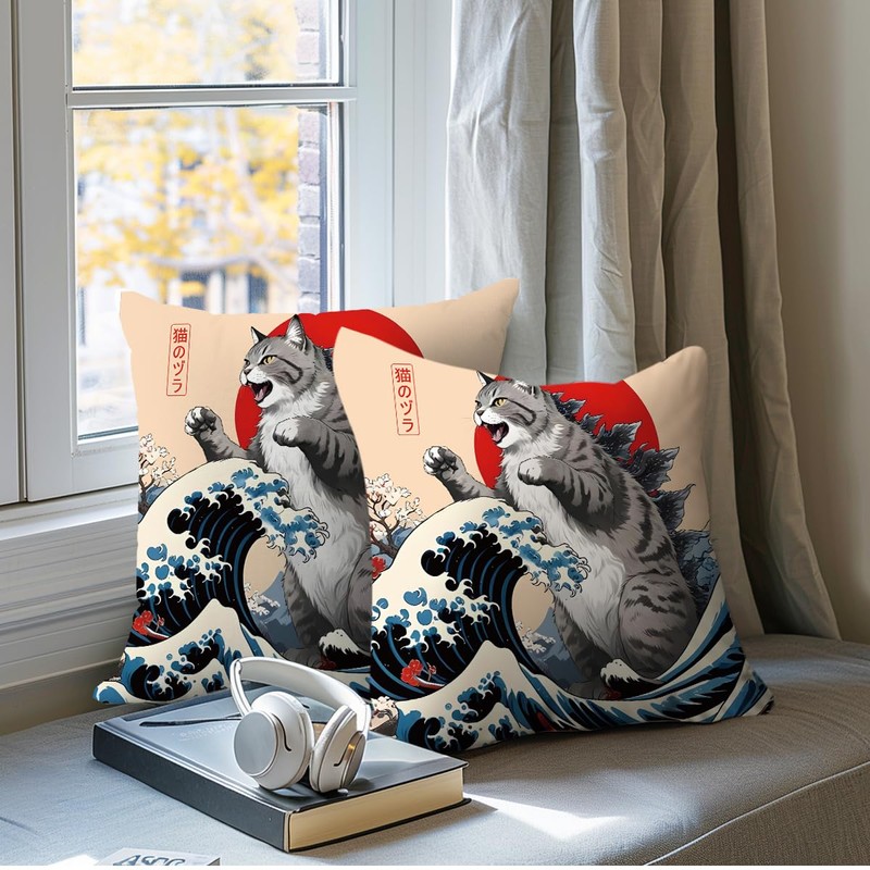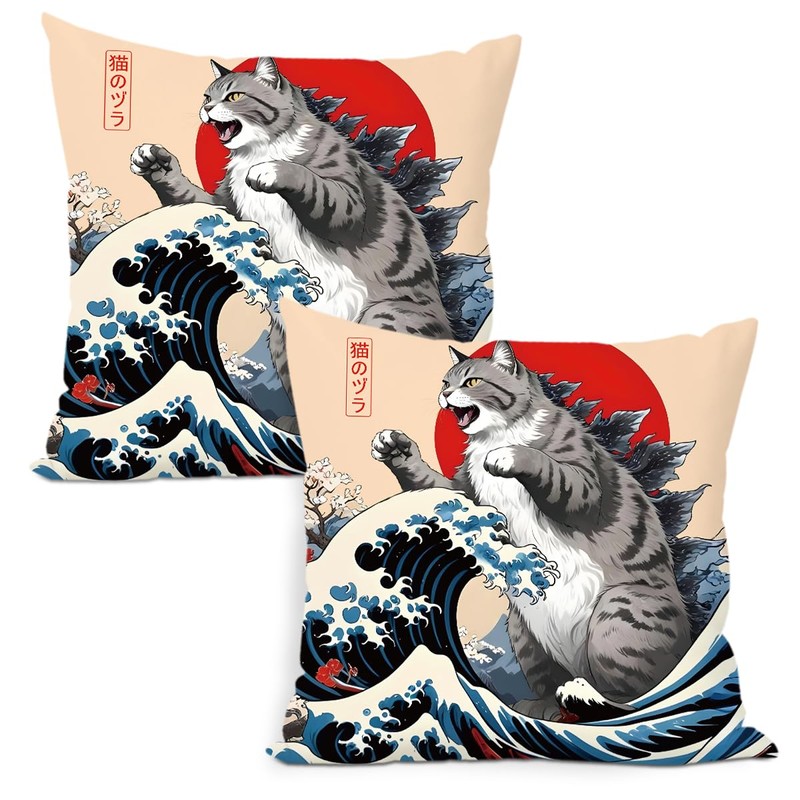 2Pcs Cat Pillow Covers 18x18 Inch, Ocean Waves Pillows Covers with Square Pillowcases, Weird Cats Throw Pillow Cover for Living Room Home Sofa Bedroom Decor, Cat Lover Gifts for Women Mom Friend