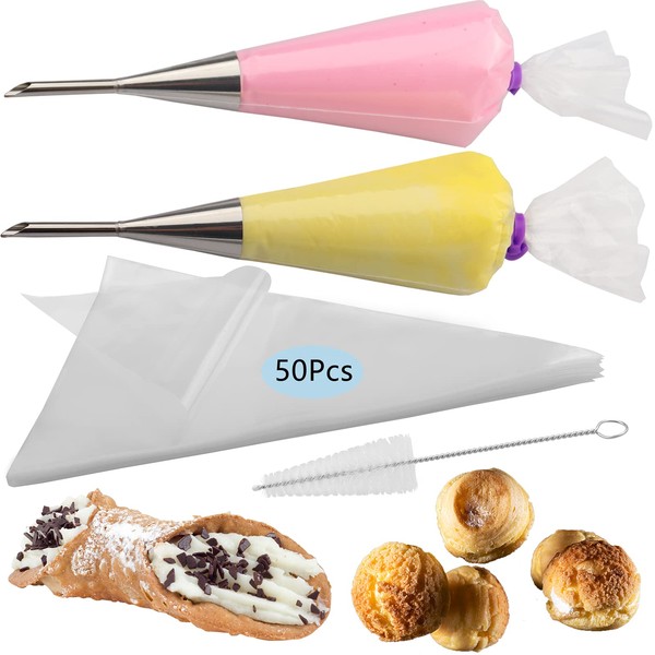 2Pcs Cream Icing Piping Nozzle Tip Stainless Steel,Long Puff Nozzle Tip with 50Pcs Disposable Pastry Piping Bags Cupcake and Puff Filling Kit Decorating Tool Supplies
