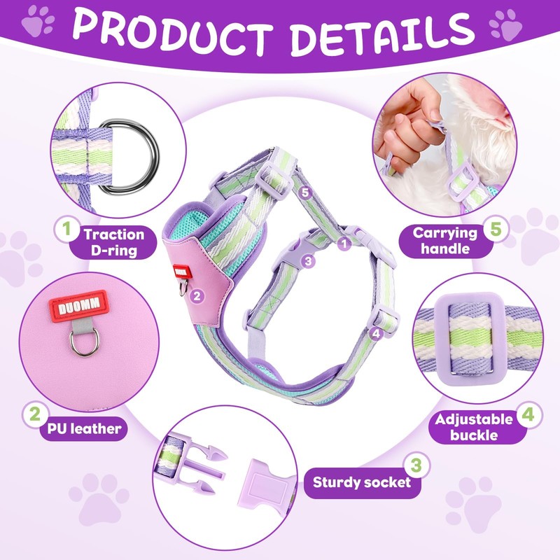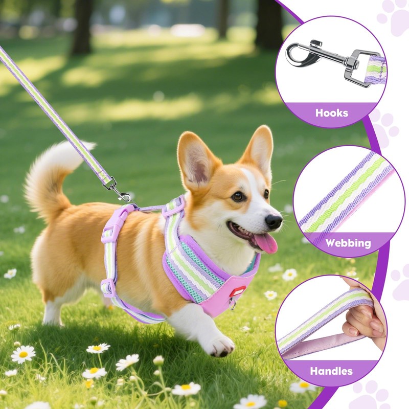 - 【Comfortable and Breathable】Our soft mesh dog harness features a mesh design for ultimate comfort. The breathable material keeps your pet cool on walks, perfect for all seasons. Available in vibrant purple and bright yellow to suit your dog's personality.