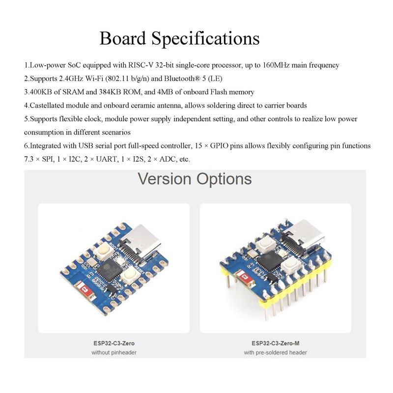 - ESP32-C3 Mini Development Board, Based on ESP32-C3FN4 Single-core Processor. Low-power SoC equipped with RISC-V 32-bit single-core processor, up to 160MHz main frequency