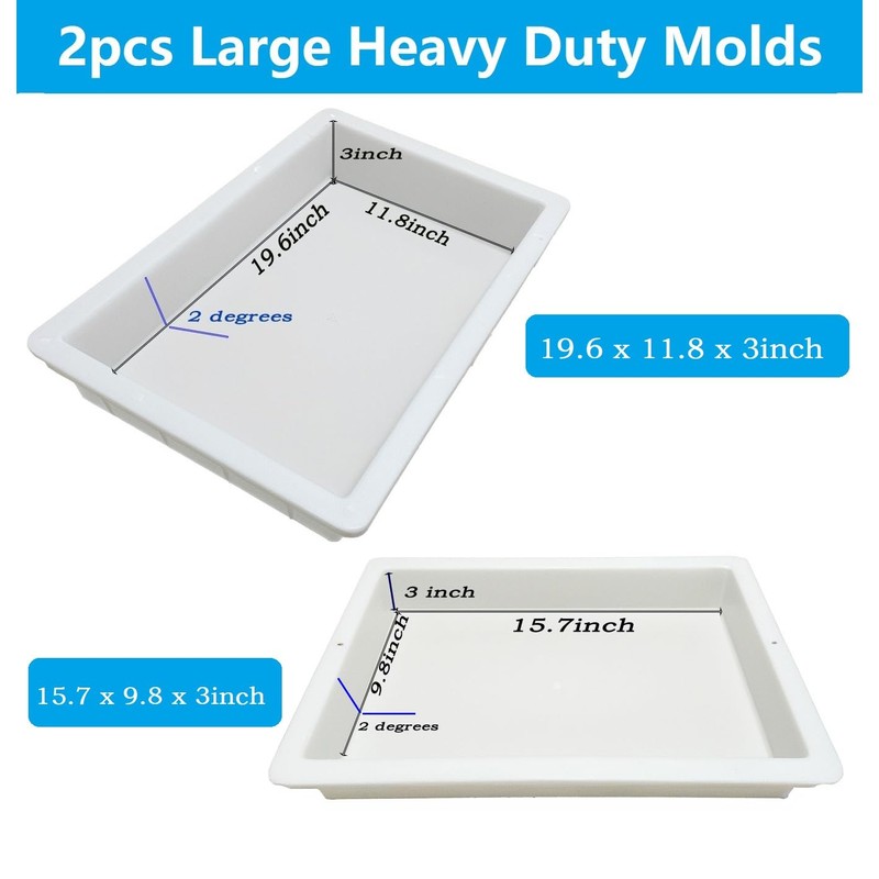 - PACKAGE INCLUDES:You will get two large heavy duty molds, one rubber mallet, the two molds are 19.6x11.8x3 inches and 15.7x9.8x3 inches in size, they are not made of silicone, but made of hard and strong PP material, light weight, no need to install, can be used in any space easily!