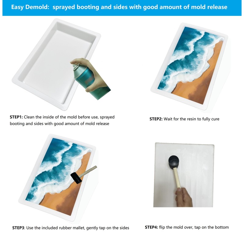 - Easy Demold: Our molds have smooth inner surfaces and 2 degrees outward tilt on the sides, clean the inside of the mold before use, sprayed booting and sides with good amount of mold release, wait for the resin to fully cure, use the included rubber mallet, gently tap on the sides, flip the mold over, tap on the bottom, and easily complete the release.