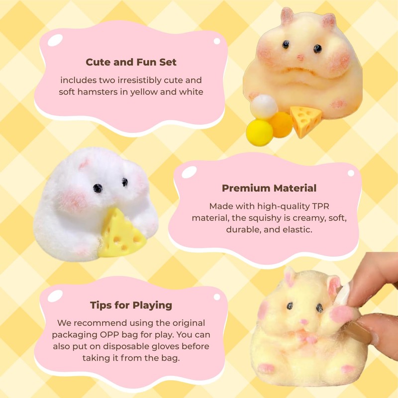 - Cute and Fun Design: This set includes two irresistibly cute and soft hamsters in yellow and wh1te, each with vibrant colors that bring joy. These squeeze toys not only provide relaxing stress relief but also make delightful desktop decoration, adding a fun touch to any space.