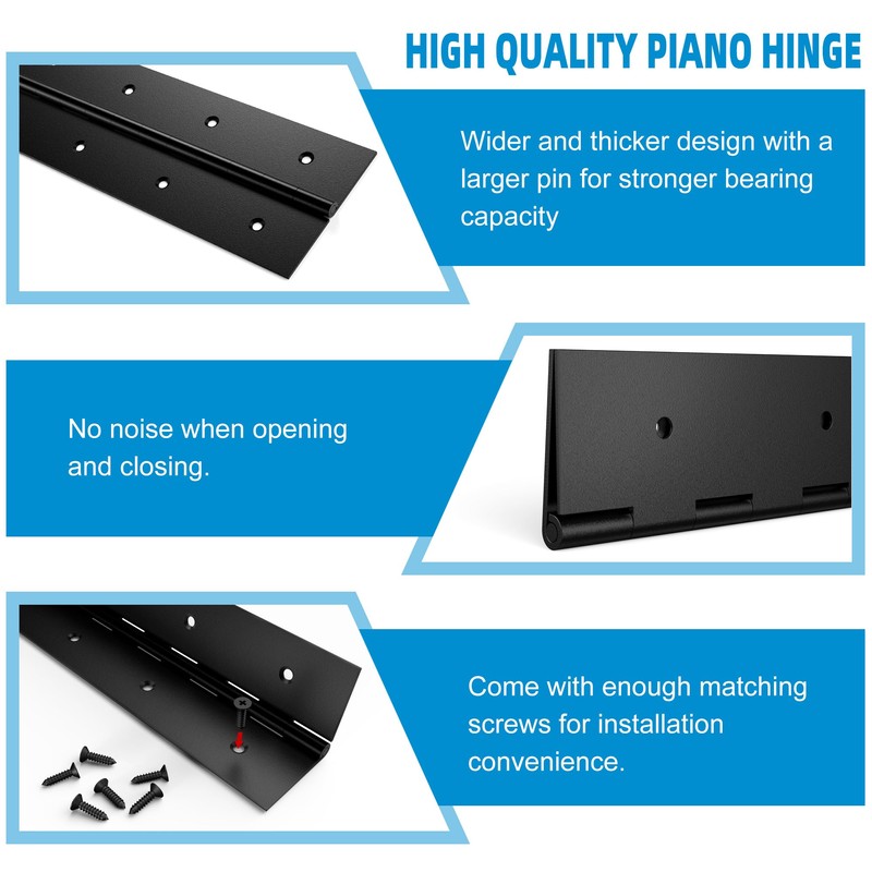 - 【2pcs 30 Inch Piano Hinge & Screws】The package contains 2pcs 30 inch black piano hinges and a sufficient number of screws, eliminating your worry about purchasing screws. You can start your creation immediately upon receiving the package.