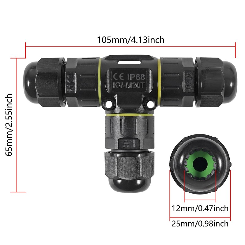 - M20"T Shape"Junction Box Power Cable Connector: Available for 2 or 3-core cables,Cable Size : Ø5-8mm,wire diameter:Ø0.5-2.5 mm²(AWG24-13). the connectors include "live wire"&"neutral wire"&"earth wire". Rated voltage: Max 450v, rated current: Max 24A