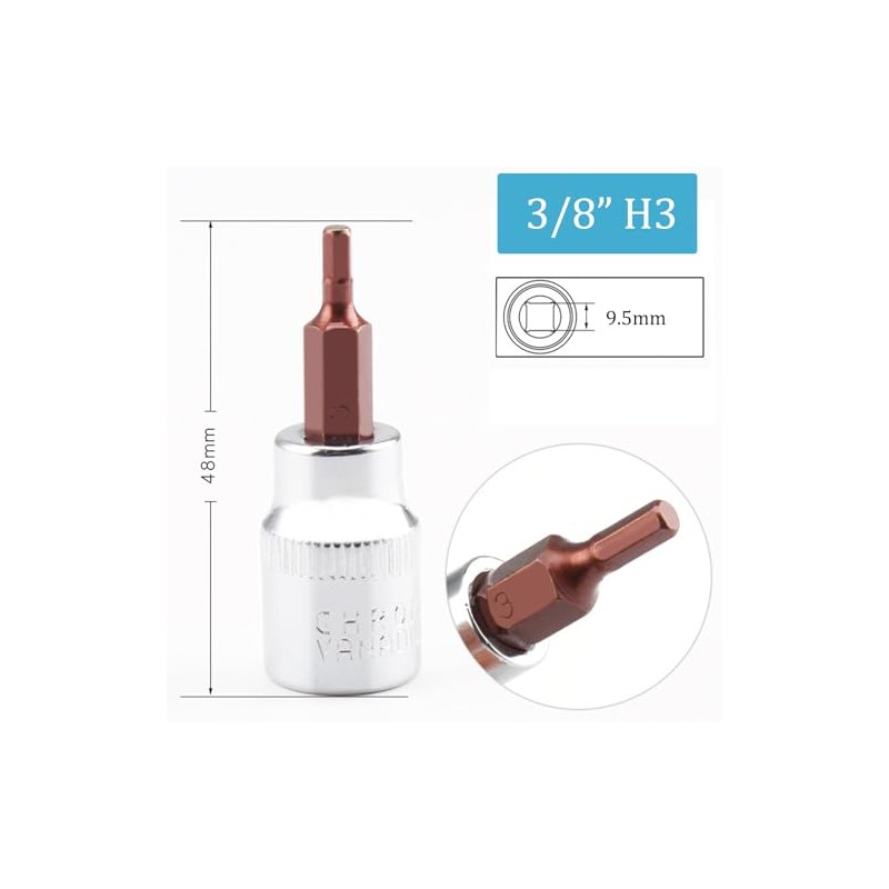 - Size - 3/8"square drive socket, H3 (3mm) hex bit, 1.89 inch (48mm) total length.
