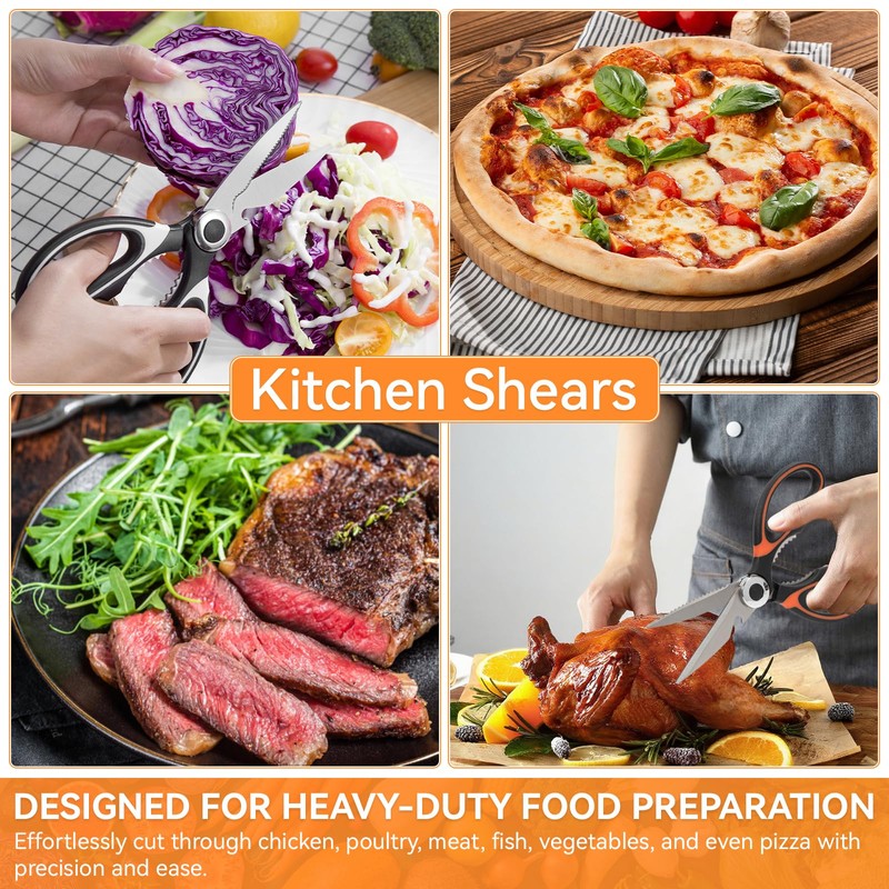 - 【Versatile Cutting Power】: These kitchen scissors are designed for heavy-duty food preparation. Effortlessly cut through chicken, poultry, meat, fish, vegetables, and even pizza with precision and ease. A true all-rounder —perfect as cooking kitchen shears, food scissors, poultry shears, or meat scissors.