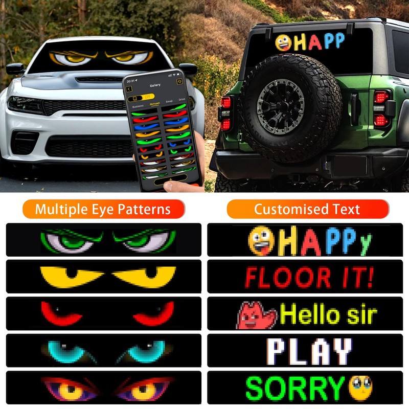 - 【Customizable Flexible LED Display】Get creative with our mobile APP! Display text, patterns, doodles, animations, or even your own logo. Transform your LED windshield eyes into a moving piece of digital art in just a few taps