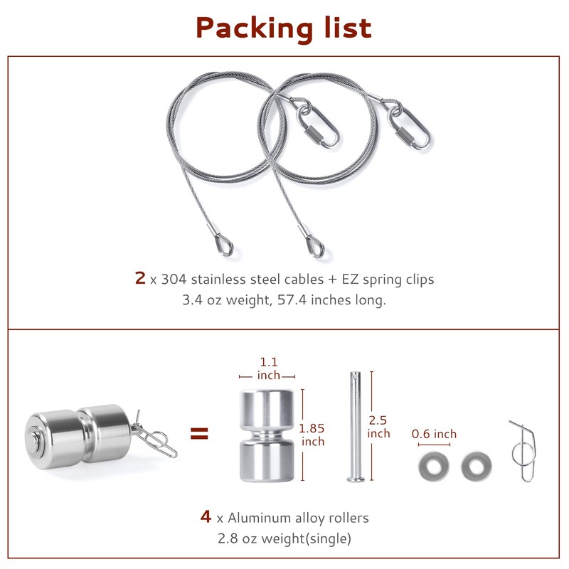 Included Components:2*EZ Spring Clips, 2*Lift Cable, 4*Aluminum Alloy Rollers Pins Washers