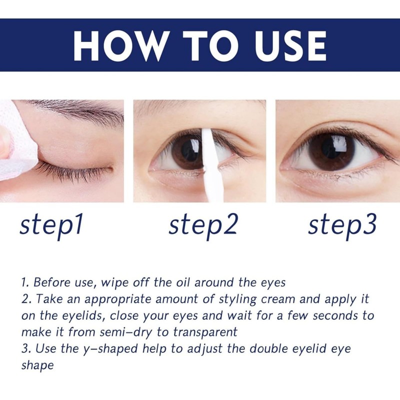 - EASY TO ABSORB:Our double eyelid cream is very easy to use and dries quickly.Our double eyelid glue don't require you to spend much time on double eyelid pen.Our double eyelid shaping cream can keep your eyes comfortable for a long time.Our double eyelid stickers can broaden your eyes and double eyelid styling cream make you the center of attention in the crowd.Our double eyelid tape will bring you lustrous eyes