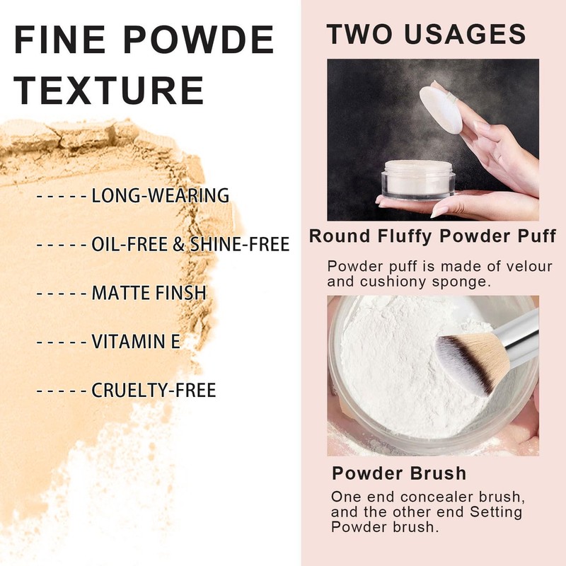Package Include:Makeup Setting Loose Powder *2+ Fluffy Puff *2+Loose setting powder brush *1