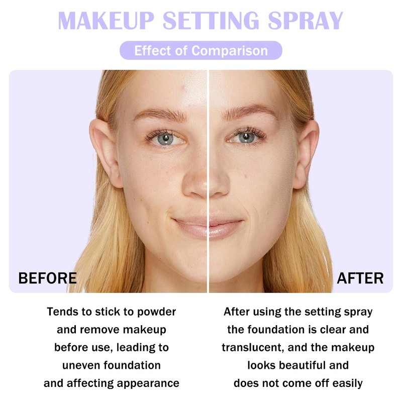 • Refreshing and Moisturizing: Fixing spray makeup contains quick-drying, moisturizing, and waterproof ingredients that quickly form a film that not only sets makeup for a long period of time, but is also waterproof, sweatproof, and moisturizing, ensuring that your makeup stays clear and natural at all times
