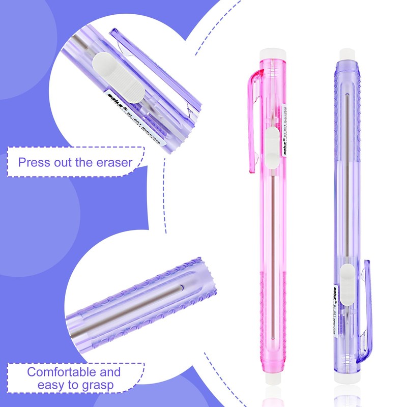 - 【Pen Shape & Easy to Store】There will be 2 packs of the pen style eraser sets, including 2 retractable eraser pen shells in different colors(purple+pink)and 6 eraser refills.The size of the pen-style earazers are 13.4*1.6cm/5.26*0.63inch.And the shape of the pen style erasers are more convenient to store,which can be stored together with pencils