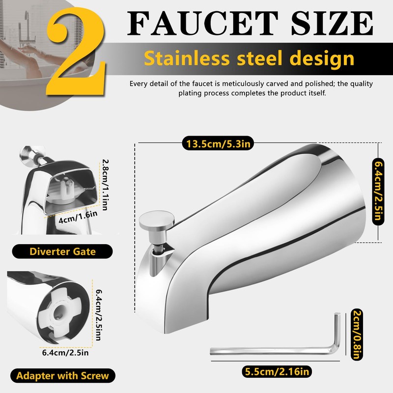 - Easy to Use: This faucet for bathtub’s size is designed carefully to fit ergonomically into the shape of most people's palms, so it is comfortable to hold. Meanwhile, this tub diverter spout uses a lift switch, easy to use, and convenient for you to control water flow at any time, create a comfortable bathing atmosphere for you
