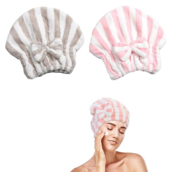 2PCS Microfiber Hair Drying Towels | Super Absorbent Turban Cap | Quick-Dry Head Wrap | Bow Knot Shower Cap | for Curly, Long, Thick Hair | Light Pink & Light Brown