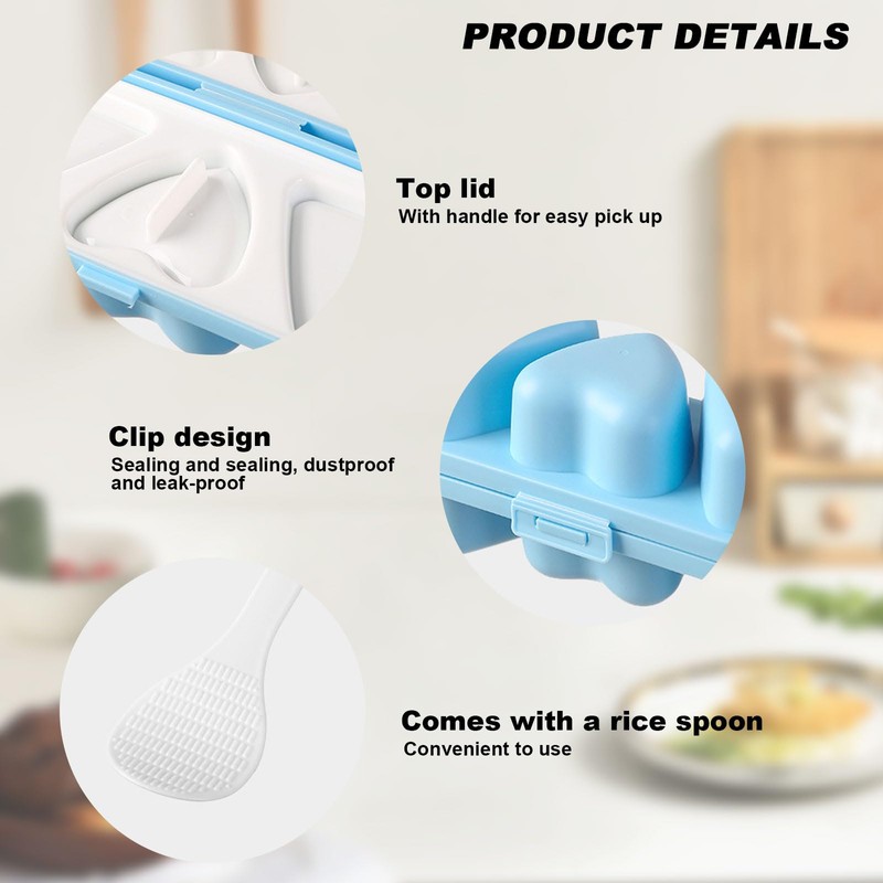 - Multifunctional: The rice ball mould press One side can hold 3 rice balls, the other side can hold side dishes, the press lid can be used as a lid, and the onigiri sushi mould can also be used as an onigiri box, put the rice balls inside and take them anywhere.