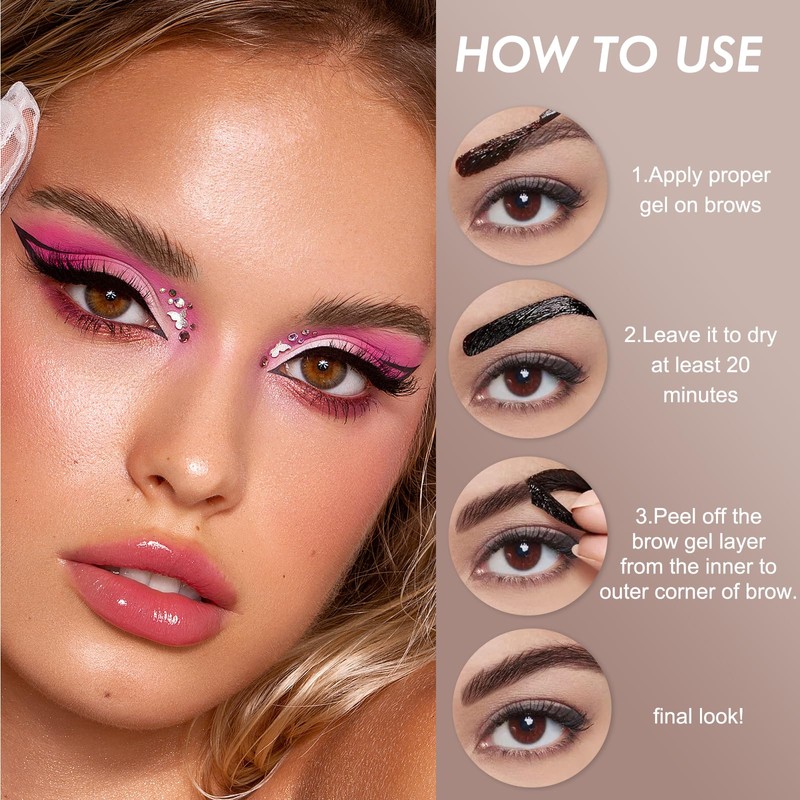 - 【Effortless Application & Peel-Off Convenience】Achieve professional-looking brows with ease. The precision brush allows for smooth, even application, adapting to any brow shape. Simply apply a thin layer of this waterproof eyebrow gel, let it dry for 20 minutes, then peel off to reveal naturally tinted, defined brows. No mess, no complicated removal—just quick, hassle-free beauty.