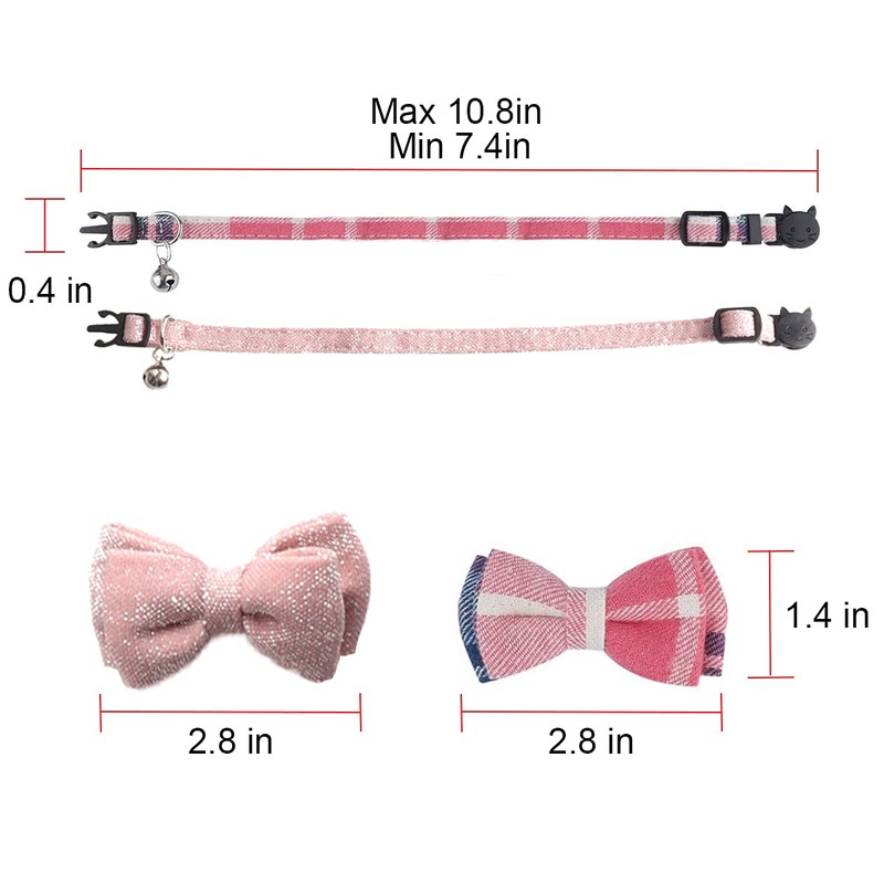 **The pink breakaway cat collar with bow, which is not only cute, but also provide your cat with safety.** Size: 7.4"-10.8" in Length, 0.4" in Width Style: Plaid+Bling Material: Durable polyester fabric Target Audience: Cat,Puppy **Features:** **1.Pink Style** Your cat will be cuter and more fashionable. The pink style will get people's love. **2\. Removable Bowtie** Attached to the collar with 2 elastic bands, so it is movable and very convenient. **3\. Breakaway Buckle** The cute cat face safe buckle buckle will be effortless put on and off to prevent danger, protect the safety of cats. **4\. Bell Accessories** Every cat collar match bell to help keep track of your kitten’s whereabouts and drive away small animals. Also the bell is detachable, If you don't want hear the loud when sleeping, Just take it off. **5.2Pack** 1*Pink Plaid cat collar, 1*Pink Bling cat collar, best gift for your cats.