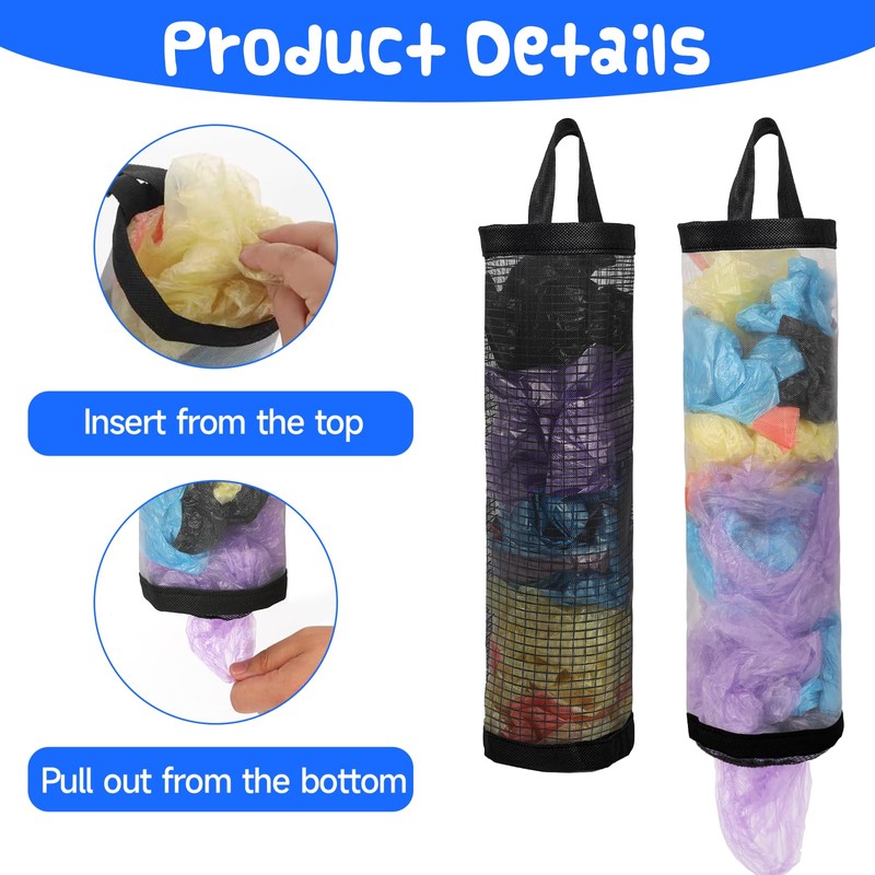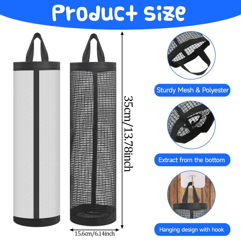 - Package Includes: You will receive 2 mesh plastic bag storage organizer and 2 transparent hooks, with an elastic opening design that allows you to easily remove plastic bags from the bottom, making your life more comfortable and convenient.