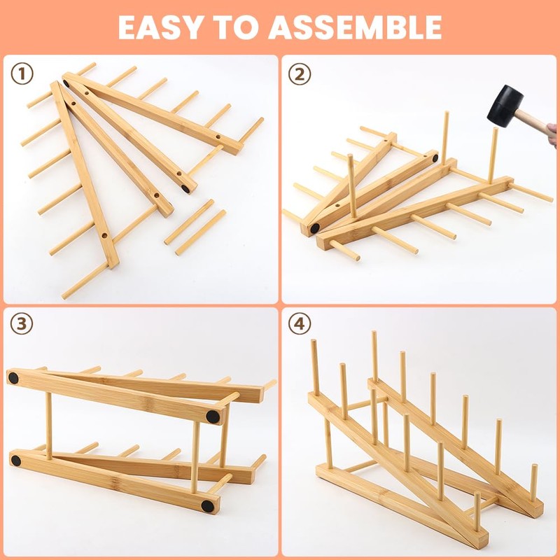 - 【Easy Assembly】 The tableware display rack includes 5 parts: 2 inclined shelves and 3 connecting rods. Each shelf has 3 holes. Align the hooks with the grooves and gently tap with a hammer to secure the wooden rods into the grooves, ensuring tight connections between all parts.
