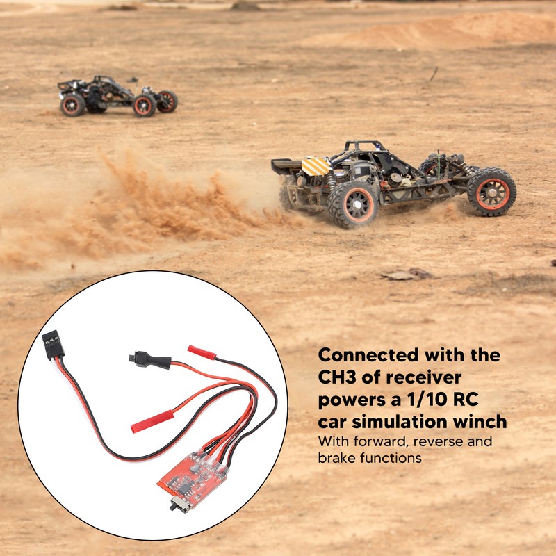 1、Applicable Models: Brushed electric speed controller can be used with 130/180/260/280/380 and other brushed motors and for 1/16 1/18 1/24 RC car boat. 2、Stable Performance: The RC ESC is connected with the CH3 of receiver can provide power to a simulation winch for 1/10 remote control cars, enhancing the overall functionality. 3、Main Functions: The ESC speed controller features forward, reverse, and brake functions, providing comprehensive control options for the RC vehicle. 4、Long Lasting: Made with high grade materials and exquisite craftsmanship, this RC electric speed controller is built to last and can be used for extended periods of time. 5、Easy to Install: Designed to use the receiver as the power source, this speed controller is easy to install. Anyone can easily operate it.