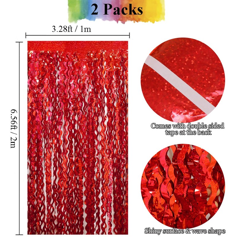 - Package Include: 2 pack red sparkle wavy tinsel curtains, size (wide x drop): 3.28 x 6.56 ft (1 x 2 m). Brand new fantastic quality party decoration photography curtains