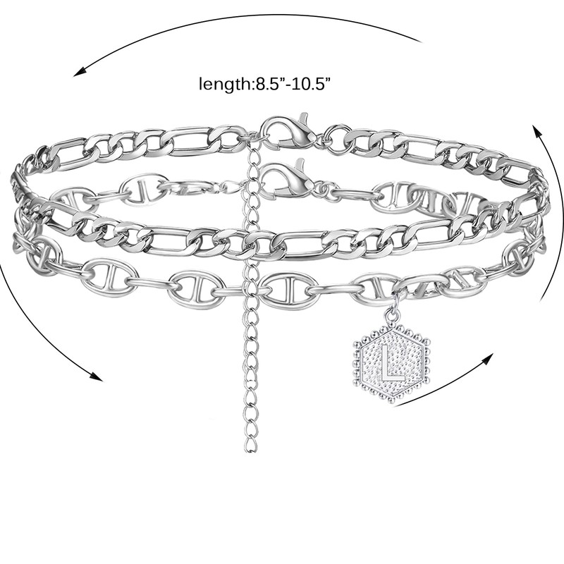 2PCS Silver Initial Ankle Bracelets for Women Dainty Double Layered Cuban Link Anklets for Girls Beach Foot Jewelry (L)