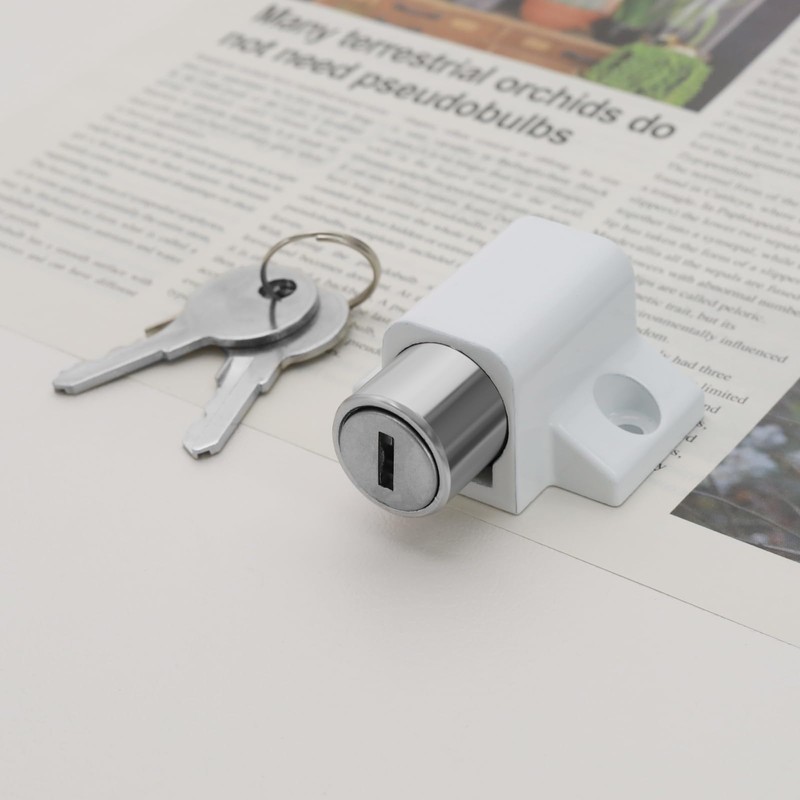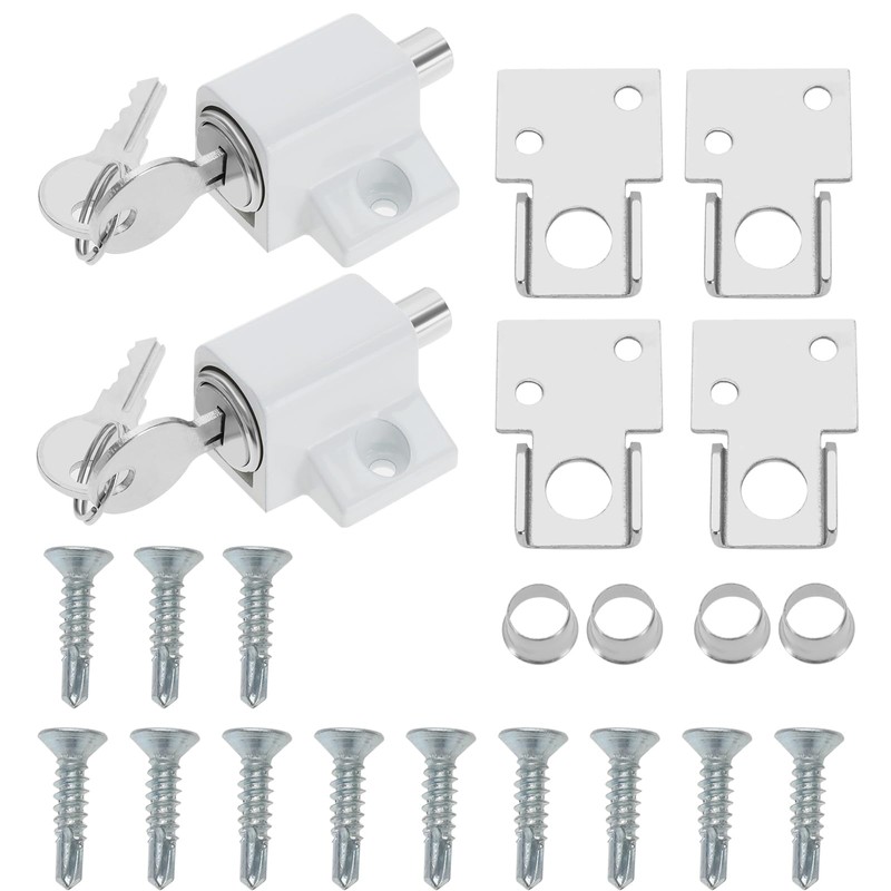 - Package: Includes 2x white sliding window locks, 4x keys, 4x covers, 4x fixing plates, 12x screws.