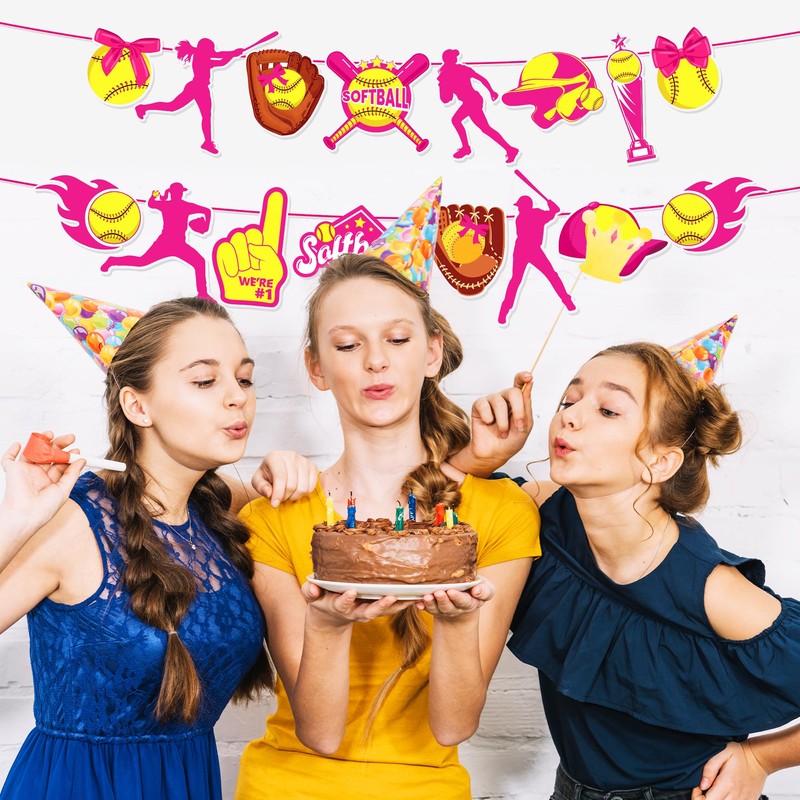 2pcs Softball Party Banners – Softball Birthday Party Decoration Easy-to-Softballs Player Party Garlands with Softballs Player, Bat & Trophy Designs for Girls Birthdays & Sport-Themed Celebrations