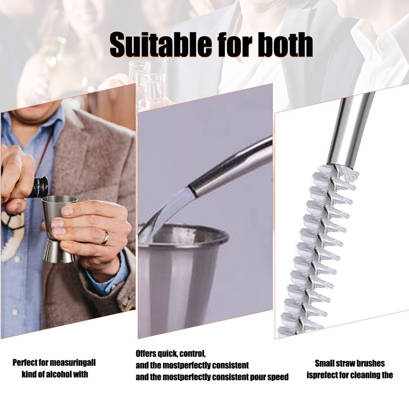 - ✔Alcohol Measure Set: Contains 2pcs drinks measures for spirits, 2pcs bottle pourers and 2pcs cleaning brush, an essential stainless steel measuring cup set for any home or professional bartender.