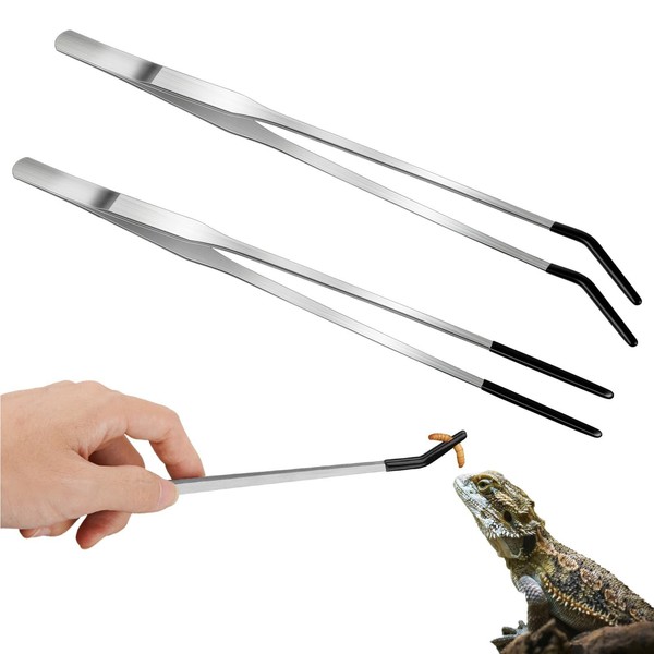 2PCS Stainless Steel Reptile Feeding Tongs with Rubber Tip,Crested Gecko Tank Accessories,10.6” Heavy Duty Extra Long Tweezers Straight & Curved Long Tweezers for Aquarium & Terrarium or Craft