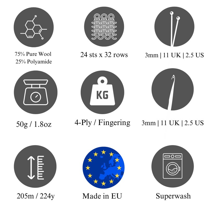 - Recommended needle size: 3mm | 11 UK | 2.5 US Knitting tension: 24 sts x 32 rows
