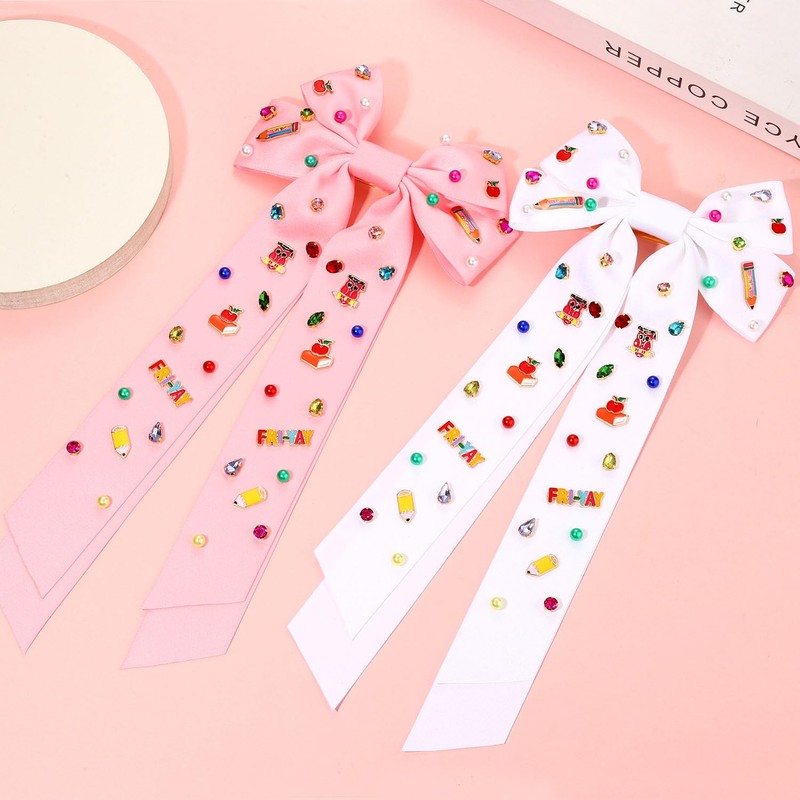 - 【Teacher Hair Bows for Women】: Great teachers are the people who make a lasting impact on our lives, show your favorite teachers some love with our back to school hair bows! Features white/pink/black hair bow adorned with book, pencil, FRI-YAY, owl charms, gorgeous pearls and crystals, symbolize your love of education! Complete your back to school day look with this awesome teacher accessories, a fun and engaging way to celebrate the first day of school and help you stand out in the staffroom!