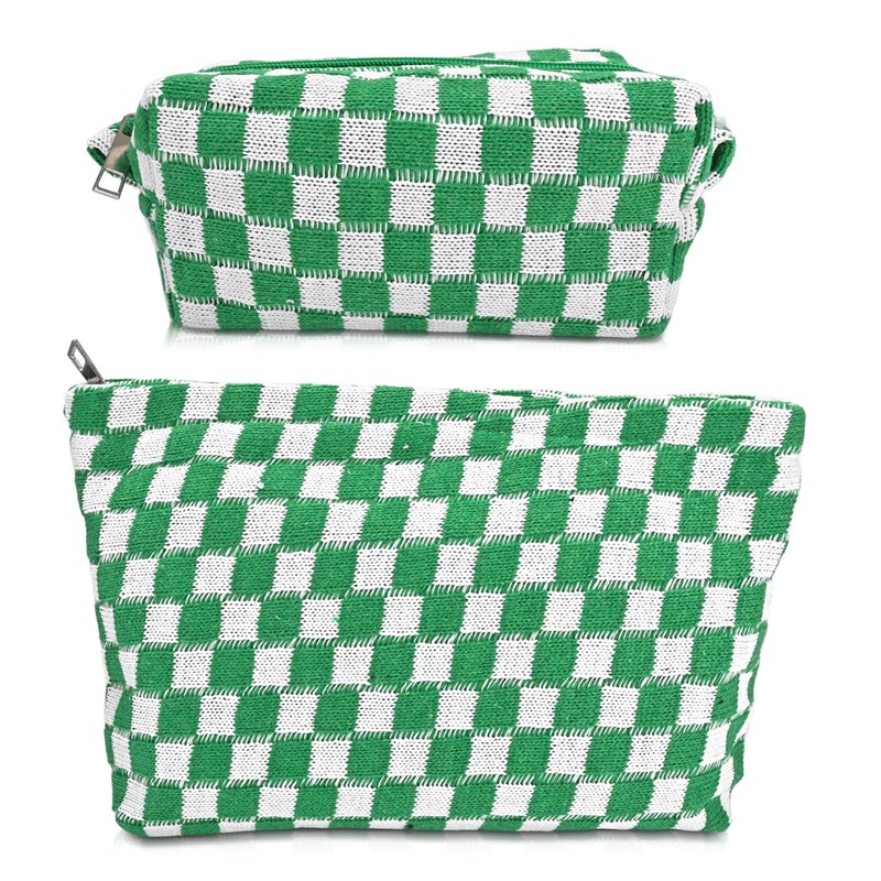 2PCS Travel Cosmetic Bag, Checkerboard Knitted Make Up Bags, Large Capacity Quilted Toiletries Bag for Women (Green and White)