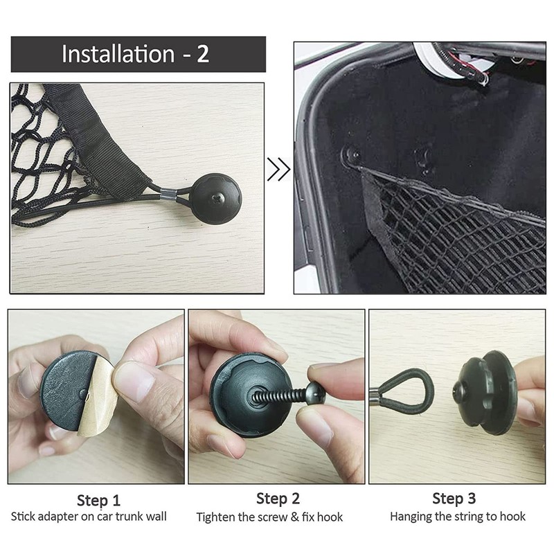 - Excellent Heavy Duty Material- Rear trunk organizer net made from strengthening polyester, comes with quality hooks and screws, ensure the durability and long service life. Easy quick to install. (2 install-methods as pictured, if you don't need the hooks, just take off).