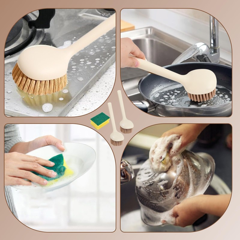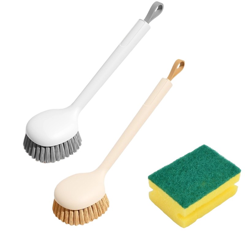 - 2-in-1 Set: Includes 2 dish brushes with handles and 1 dish sponge for versatile cleaning! Perfect for pots, pans, bowls, sinks, and countertops – saves time and simplifies kitchen tasks.