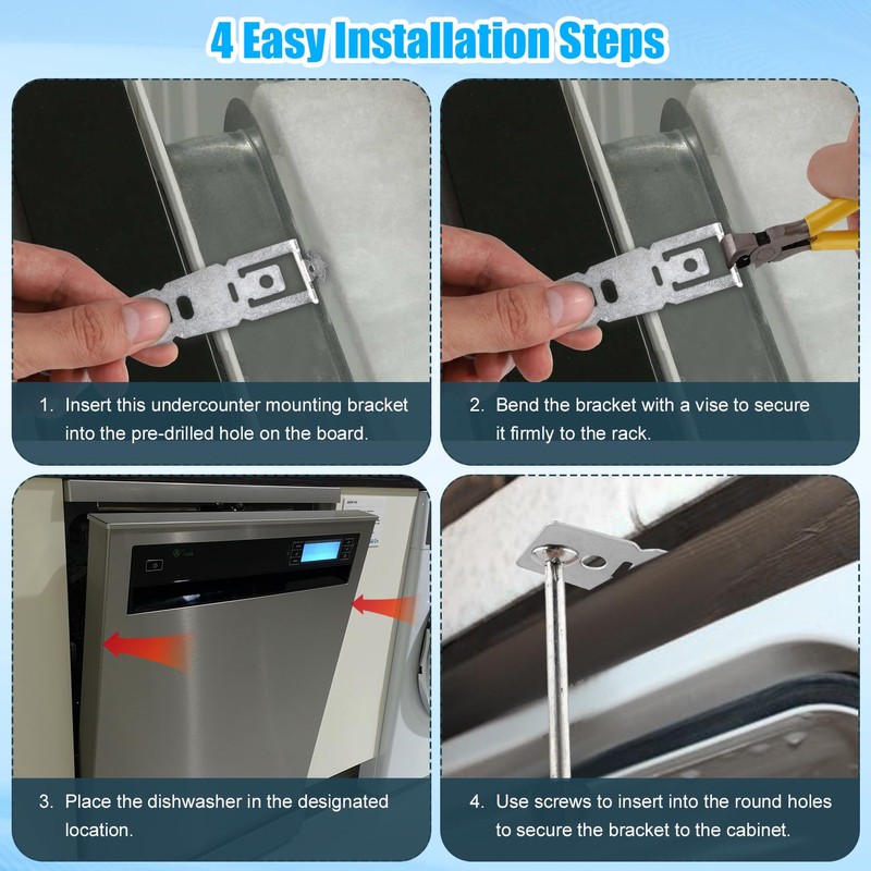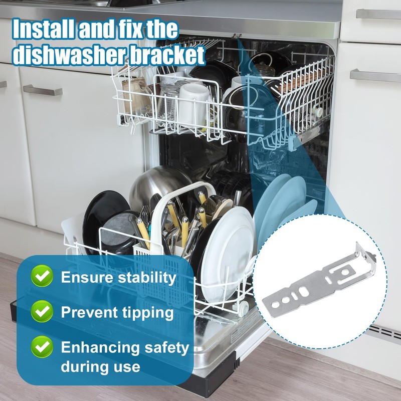 - How to Install: Our dishwasher bracket is very easy to install. Firstly, insert the bracket into the pre-drilled hole on the board; secondly, bend the bracket with a vise to fix it firmly on the shelf; thirdly, place the dishwasher in the designated position; finally, pass the screws through the round holes to fix the bracket to the cabinet.