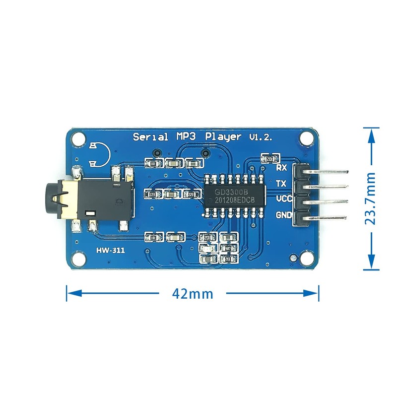 - High performance: adjustable volume of 30 class UART TTL playback mode with serial control, baud rate is 9600 bit/s. The power supply can be between 3.2 and 5.2 VDC. Size: 43mm x 25mm