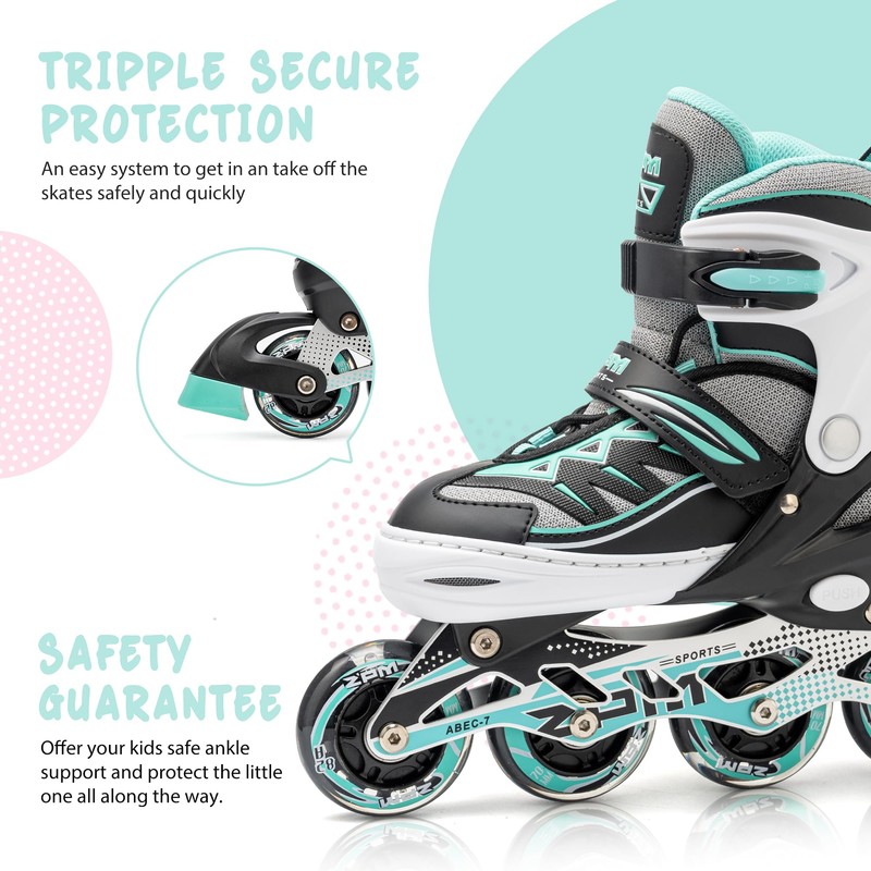 - Premium Performance - Enjoy your smooth, quite ride with high quality ABEC-7 bearings, 82A polyurethane wheels, aluminium frame and rubber(TPR) stopper. Tripple protection including laces, 45° Strap and high-strength buckle are sure to provide safe ankle support and protect you along the way.