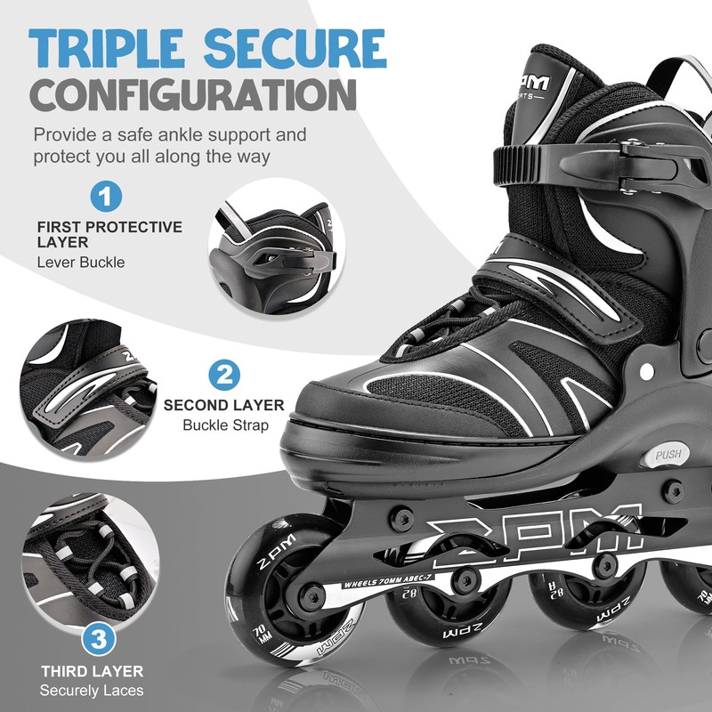 - Triple Protection: Safety is our top priority, which is why our kids' inline skates come with triple protection. The buckles, velcro strap and laces work together to keep your child's feet secure and prevent accidents. With these protection, your child is safe while enjoying their time on the rink