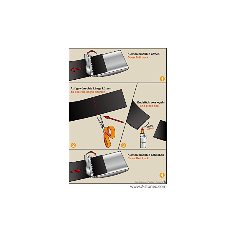 - This textile trouser belt can be individually shortened in a few simple steps (see picture with instructions).