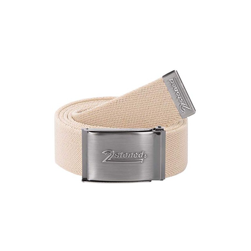 - The robust metal end piece with 2Stoned logo at the end of this elastic belt canvas belt prevents fraying.