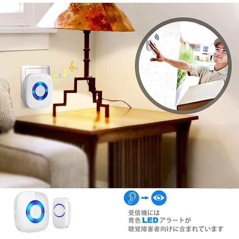 2T1 Wireless Chime, Doorbell, Waterproof, Dustproof, IP55, Wireless Range of up to 998.4 ft (300 m), Doorbell, 58 Songs Selectable, 5 Levels of Volume Adjustment, Loud Volume Adjustment from 0 to 100
