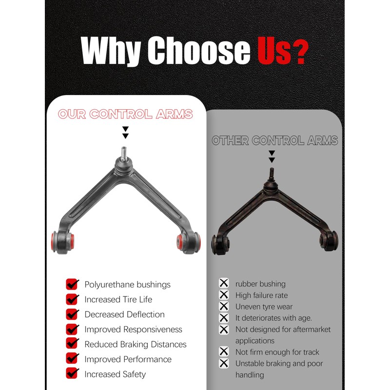 By replacing your worn or damaged control arms, you can restore the precise handling and stability of your vehicle, enhancing your driving experience and safety. Our front suspension control arms kit ensures a perfect fit and easy installation, saving you time and effort.