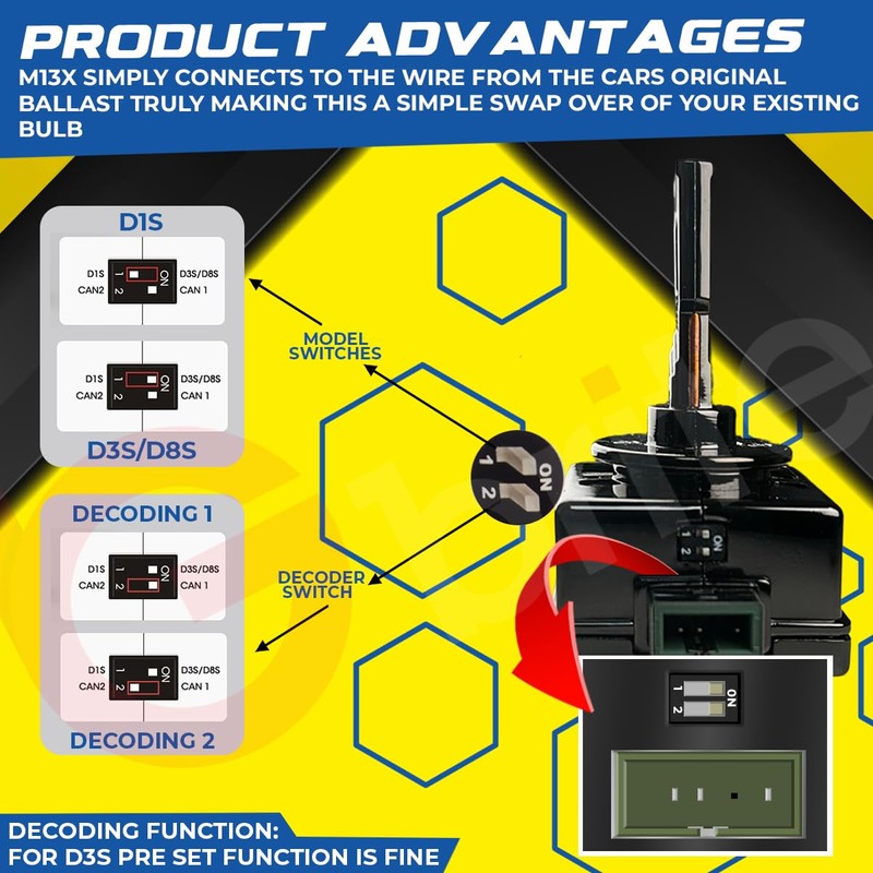 • ✅【Quick Installation】: M13X D3S led headlight bulbs as an ideal replacement, 1:1 design with xenon bulbs. Plug and play, easy to install, can directly replace the original xenon bulb of the same model.