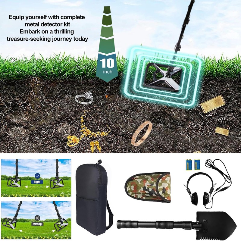 - 【5 Professional Modes&Full Treasure Kit】:All Metal Mode, Disc Mode, PP Mode,Memory Mode.Jewelry Mode, Easily identify kinds of metals;Metal detector accessories① 2xgold coins② backpack③ headphones④metal detector shovel⑤ 2x9V batteries⑥ user manual for beginners