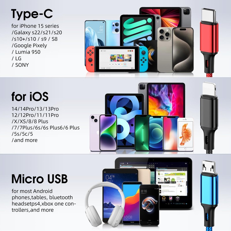 - 【ユニバーサル3イン1マルチ充電ケーブル】マルチ充電ケーブルには、Micro USBとType C/iProductポートの3つの異なる充電コネクタがあります。 市販されているほとんどの携帯電話の充電をサポートし、さまざまな日常のニーズを満たします。 (注意: 充電専用で、データを転送することはできません)。